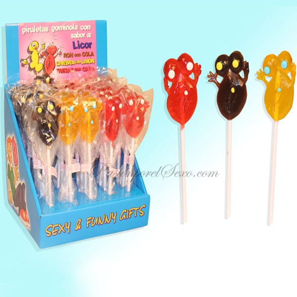 Piruletas con forma de chichi con manos, con sabores a fresa con cava, ginebra con limón y ron con cola.