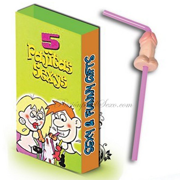 Cajita con cinco pajitas en las que se ha añadido un pequeño pito para que sean más sexy.
