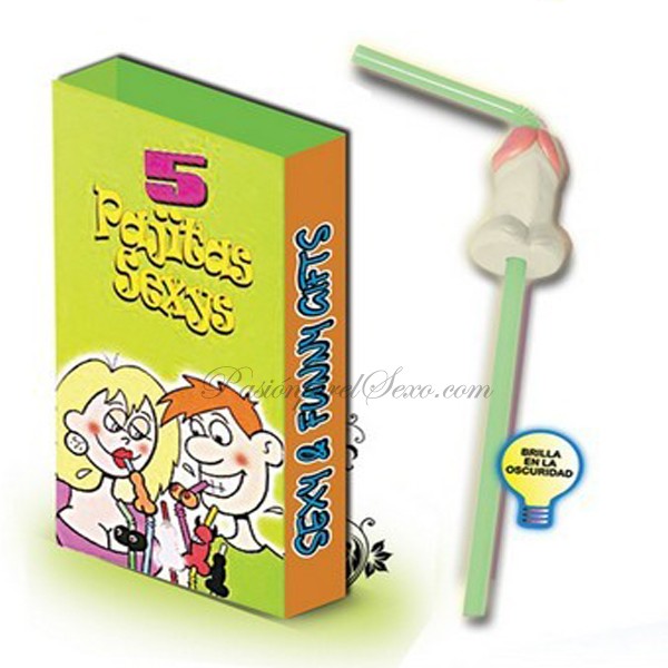 Cajita con cinco pajitas en las que se ha añadido un pequeño pito fosforescente para que sean más sexy.