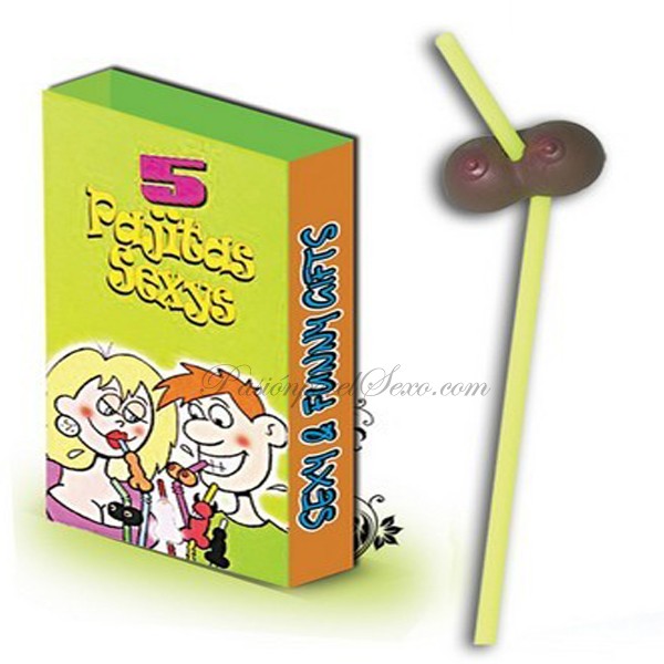 Cajita con cinco pajitas en las que se ha añadido un pequeño par de tetas en color negro para que sean más sexy.