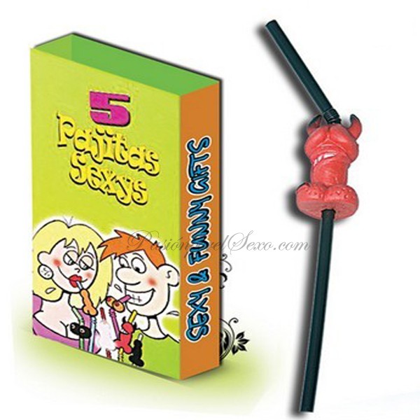 Cajita con cinco pajitas en las que se ha añadido un pequeño pito diablo para que sean más sexy.