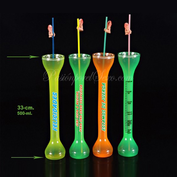 Copas para cócteles de unos 33 cm. de altura y con un volumen aproximado de 500 ml. que incluye una pajita con un pequeño pito.